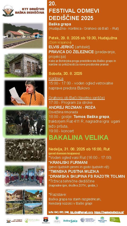 Ob 19.30 v Domu krajanov Hudajužna arhitekt Elvis Jerkič z multimedijskim predavanjem Pravica do železnice osvetljuje, kako je Bohinjska proga preoblikovala Baško grapo ter kakšne priložnosti ponuja za nove prostorske prakse.